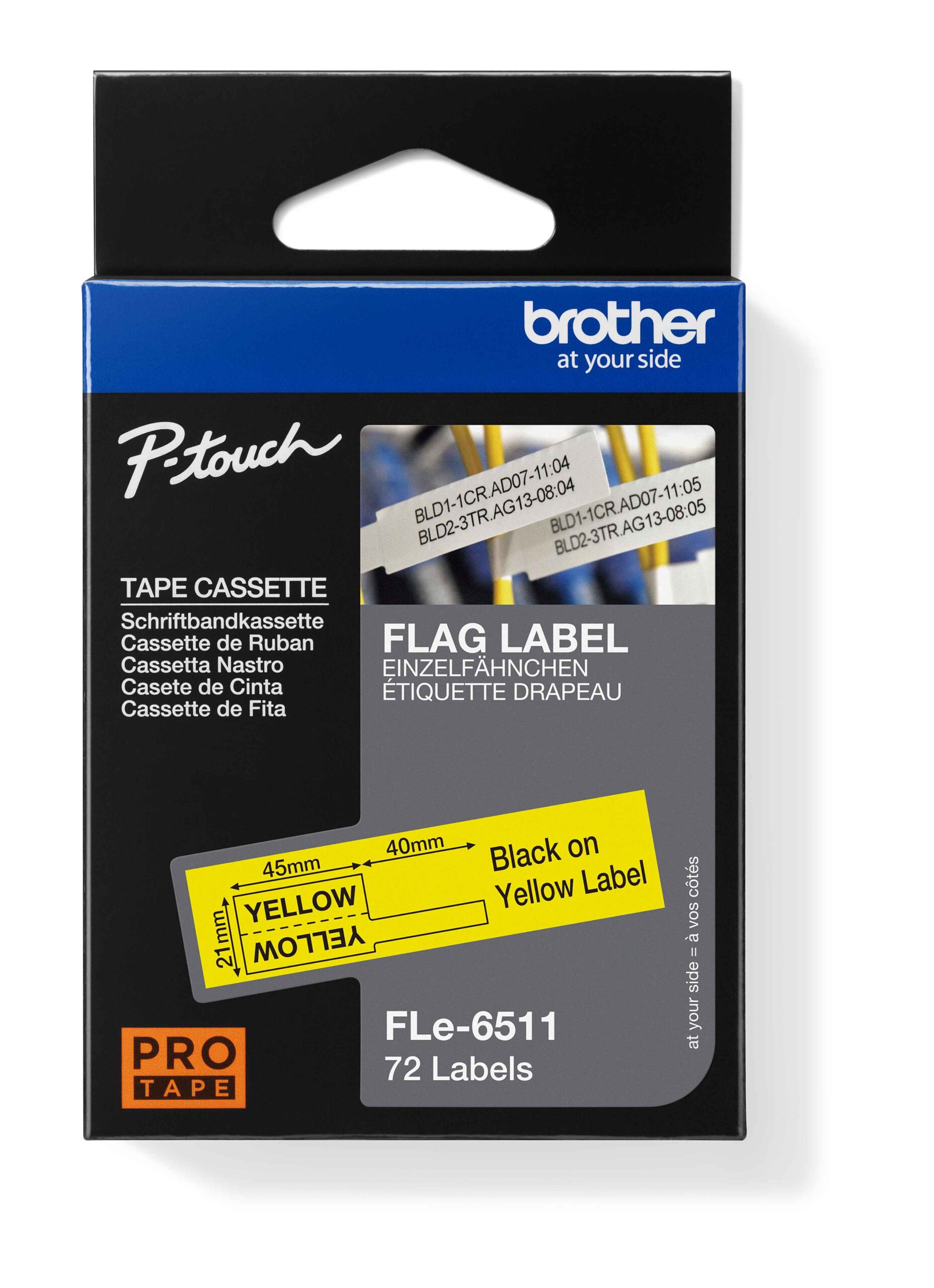 Táto popisovacia čierno-žltá páska FLe-6511 je ideálna ako pre identifikáciu káblov tak pre univerzálne použitie. Jednoducho vytlačte text alebo čiarový kód na dve časti predrezaného štítku. Pripevnite prúžok štítku okolo kábla, potom vezmite vytlačený predrezaný štítok a jednu polovicu prilepte na prúžok štítku a potom ho preložte cez druhú polovicu.