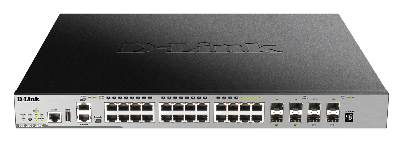 D-Link DGS-3630-28PC/SI je výkonný 28-portový L3 stohovateľný riadený Gigabit PoE switch s 10G uplinky. Je osadený 20 Gigabit portami RJ-45 s PoE 802.3at, 4 Gigabit Combo RJ-45/SFP portami a 4x 10G SFP+ portami pre uplink alebo HW stacking. Ponúka celkový PoE výkon 370W s možnosťou rozšírenia na 740W použitím externého zdroja DPS-700. Okrem L2 funkcií podporuje statický a RIP routing, pomocou licencií je možné rozšíriť o OSPF, BGP, PIM a MPLS. Switch je ideálnym riešením ako agregačný / chrbticový switch pre podnikové siete typu SMB / Enterprise, kamerové systémy a ISP poskytovateľa internetu.