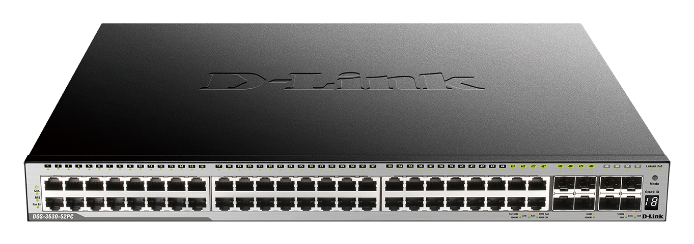 D-Link DGS-3630-52PC/SI je výkonný 52-portový L3 stohovateľný riadený Gigabit PoE switch s 10G uplinky. Je osadený 20 Gigabit portami RJ-45 s PoE 802.3at, 4 Gigabit Combo RJ-45/SFP portami a 4x 10G SFP+ portami pre uplink alebo HW stacking. Ponúka celkový PoE výkon 370W s možnosťou rozšírenia na 740W použitím externého zdroja DPS-700. Okrem L2 funkcií podporuje statický a RIP routing, pomocou licencií je možné rozšíriť o OSPF, BGP, PIM a MPLS. Switch je ideálnym riešením ako agregačný / chrbticový switch pre podnikové siete typu SMB / Enterprise, kamerové systémy a ISP poskytovateľa internetu.