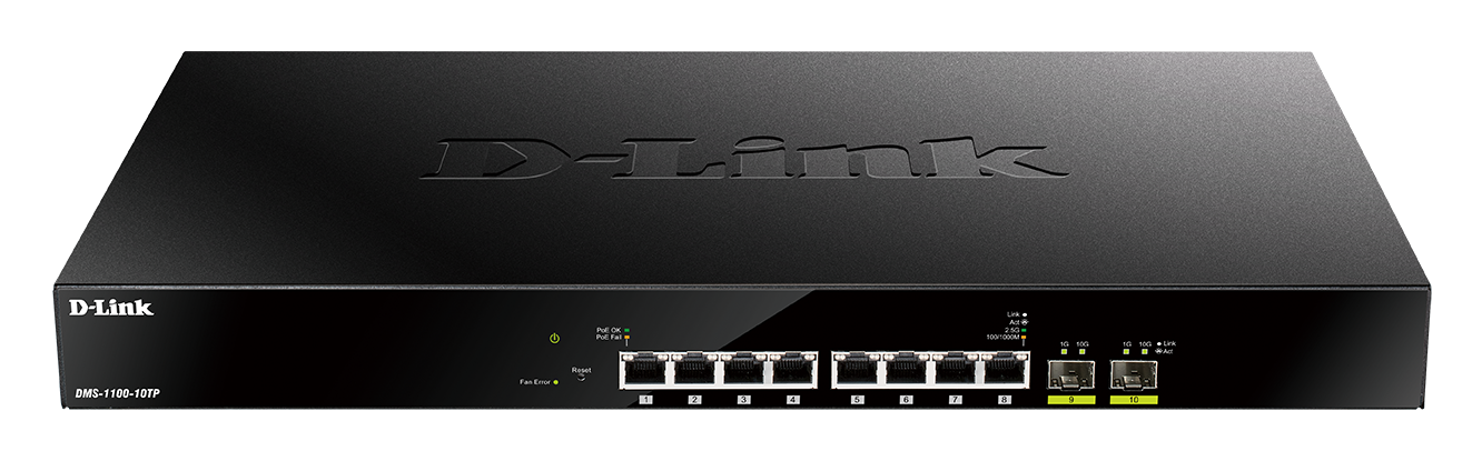 L2 switch DMS-1100-10TP ponúka osem 2,5 Gigabitových PoE+ portov RJ-45 a dva 10-Gigabit SFP+ uplinkové porty. Poskytuje multi-gigabitovú konektivitu potrebnú na maximalizáciu priepustnosti vysoko výkonných prístupových bodov 802.11ax a tiež optimálne vysokorýchlostné uplinkové pripojenie k sieťovej infraštruktúre.