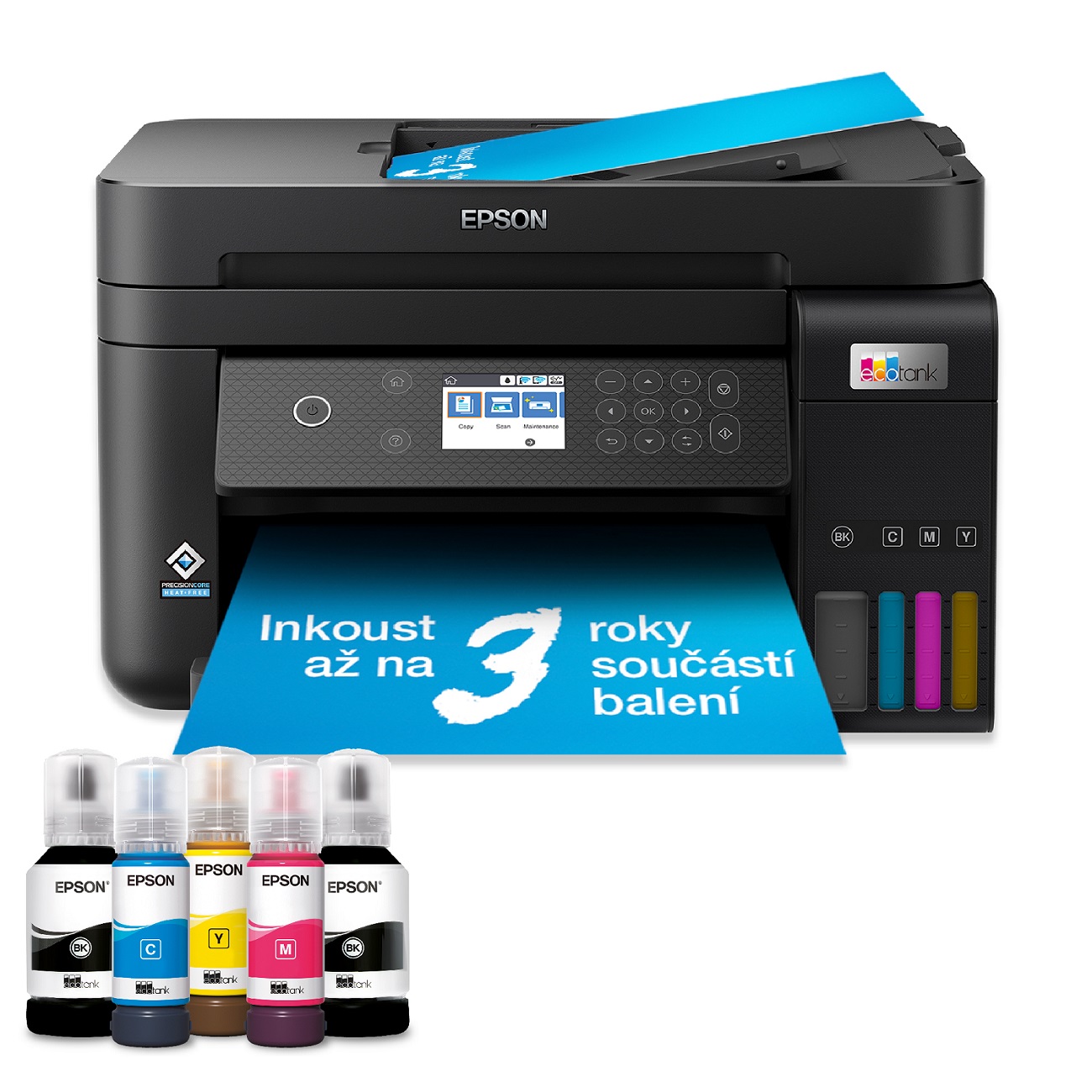 Obsah balenia: 1 sada atramentu (1 × 127 ml BK, 3 × 70 ml CMY) + Extra Black, Ovládače a pomocné programy (CD), Hlavné zariadenie, napájací kábel, Záručný dokument