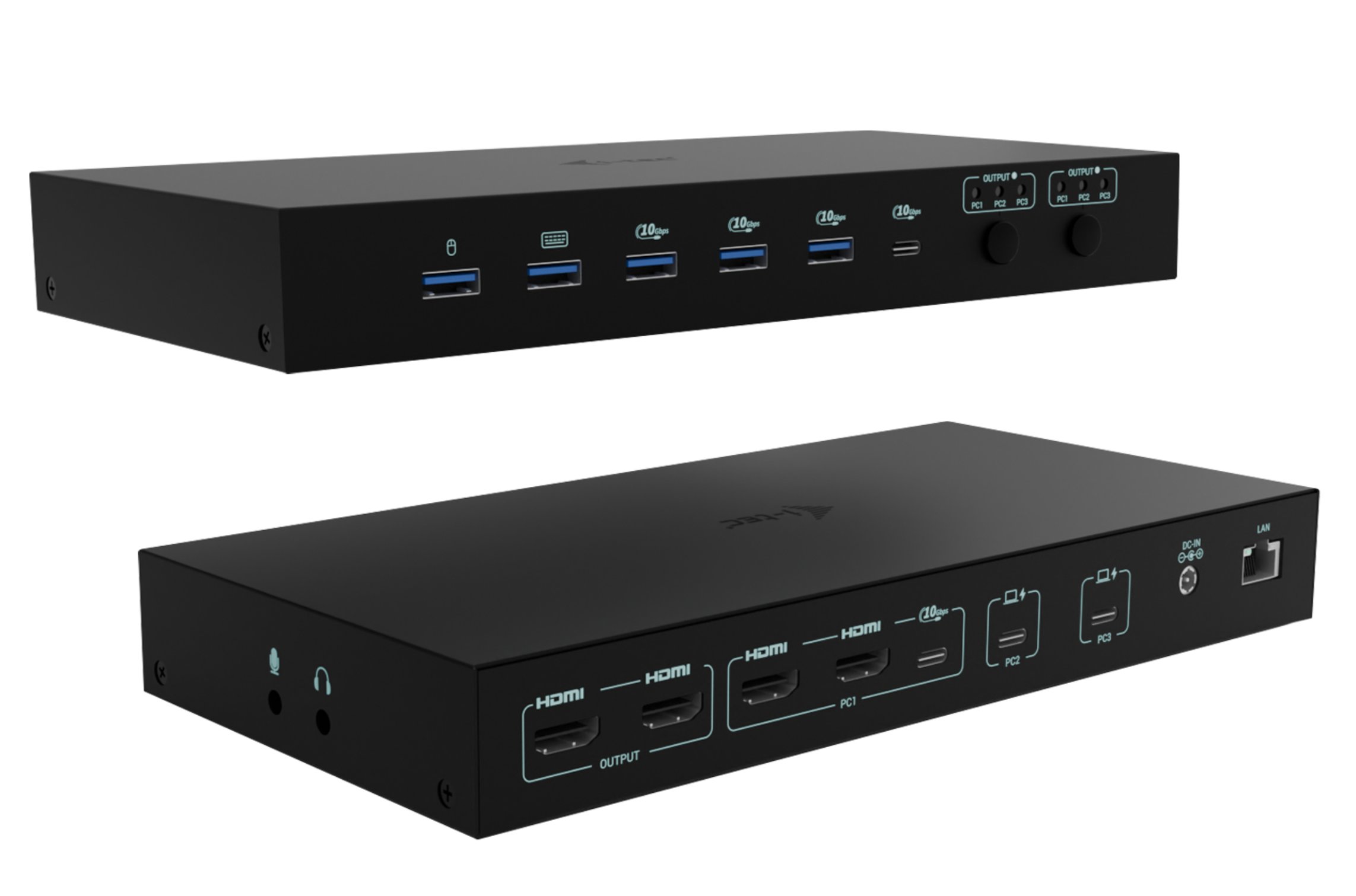 • Vstupy videa: 2× HDMI 2.0 (PC1) + 2× USB-C (PC2, PC3)