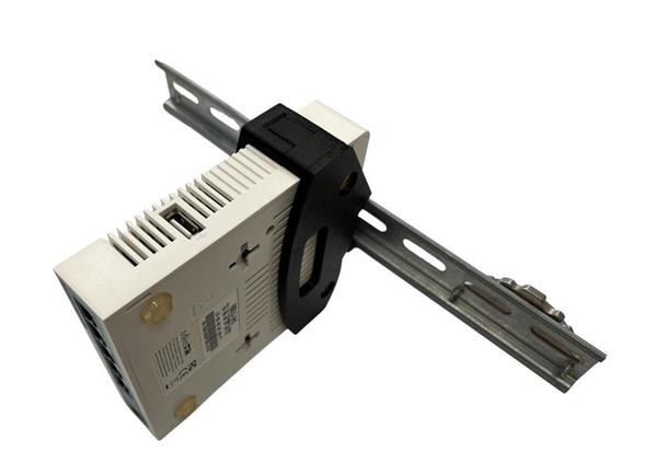 Plastový držiak na DIN lištu umožňujúci vertikálne uchytenie produktu Mikrotik hEX PoE (RB960PGS) v racku.