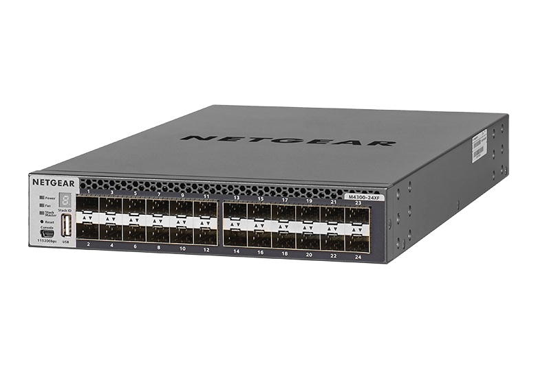 Netgear M4300-24XF 24xSFP+ a 2x10G (shared) Managed Switch. Stohovateľný managed switch s polovičnou šírkou 24x SFP+. Úplne nový rad prepínačov vyvinutý a skonštruovaný pre rastúci trh AV cez IP.