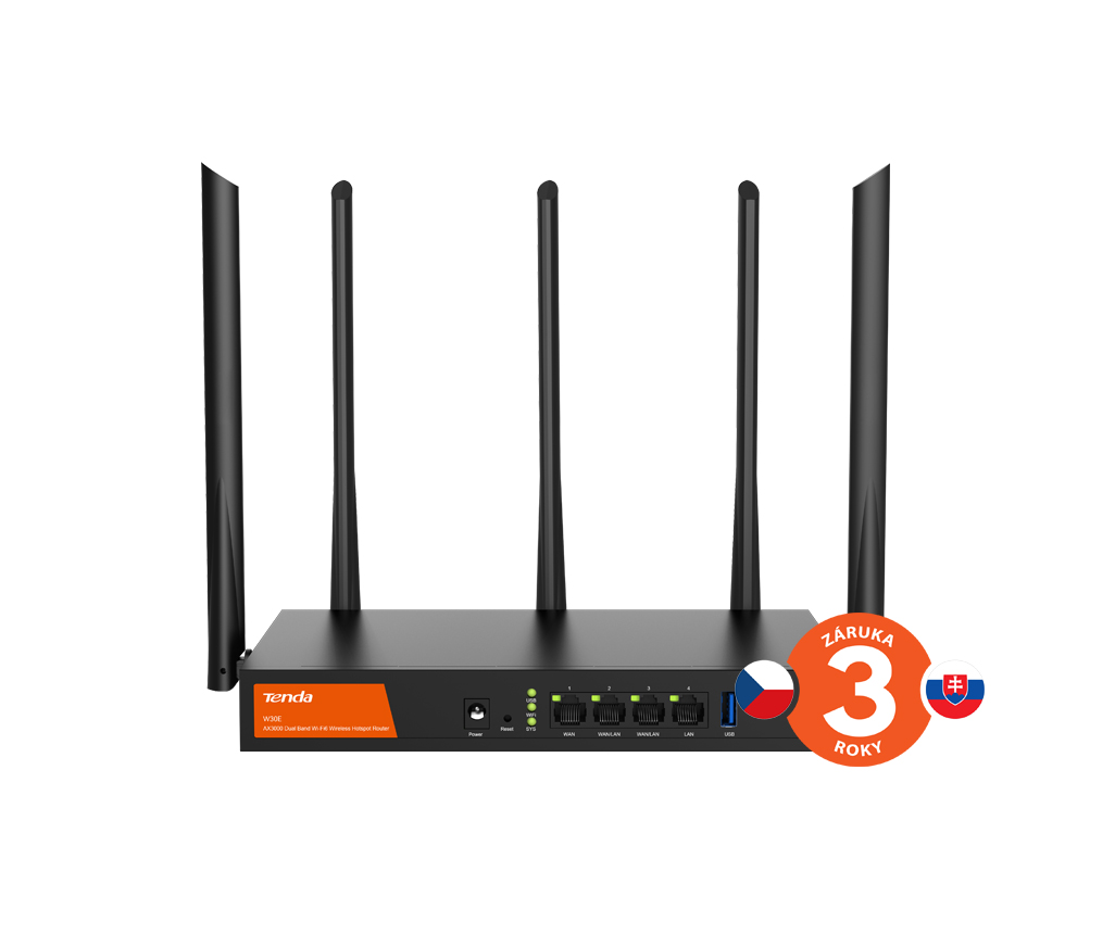 AX3000 Dual-Band Wi-Fi Load Balance Hotspot router 802.11 ax/ac/a/b/g/n, až 2976 Mb/s, 1x GWAN, 2x GWAN/GLAN, 1x GLAN, 5x anténa 6 dBi. (2,4GHz 574Mbps + 5GHz 2402Mbps), Captive portal, VPN Server / Client, Multi WAN balance, kontrolér pre AP Tenda, DDos + ARP attack protection, DDNS.
