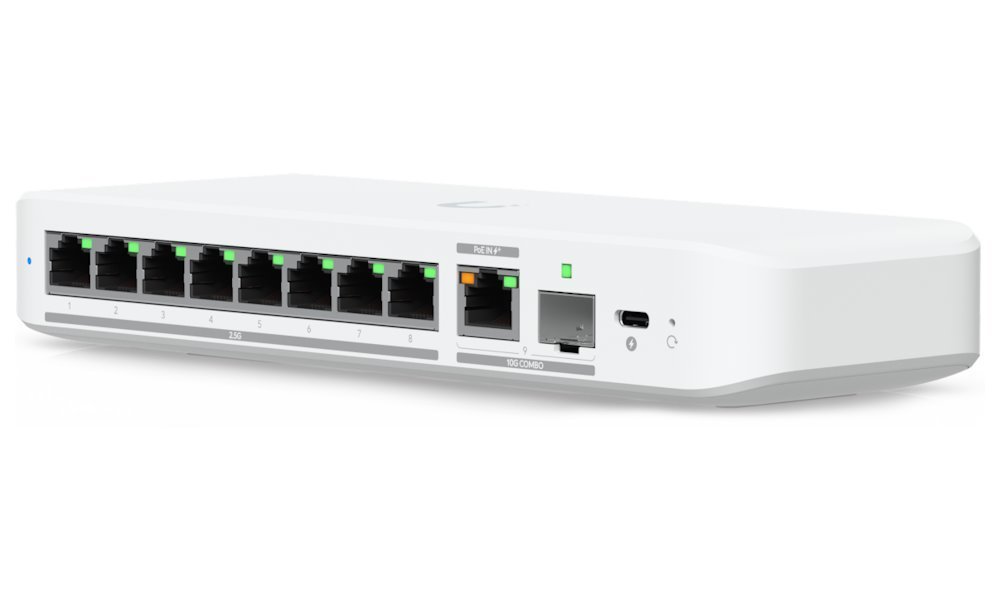 Porty: 8× ??2,5 GbE RJ-45, 1× 10G combo RJ-45 PoE+/SFP+, 1× USB-C (napájanie)
