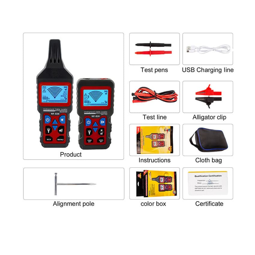 Hľadačka káblov a NCV WSNF826, voltmeter, LCD displej, dĺžka 1000m, hĺbka až 2m, AD/DC 12 – 400V.