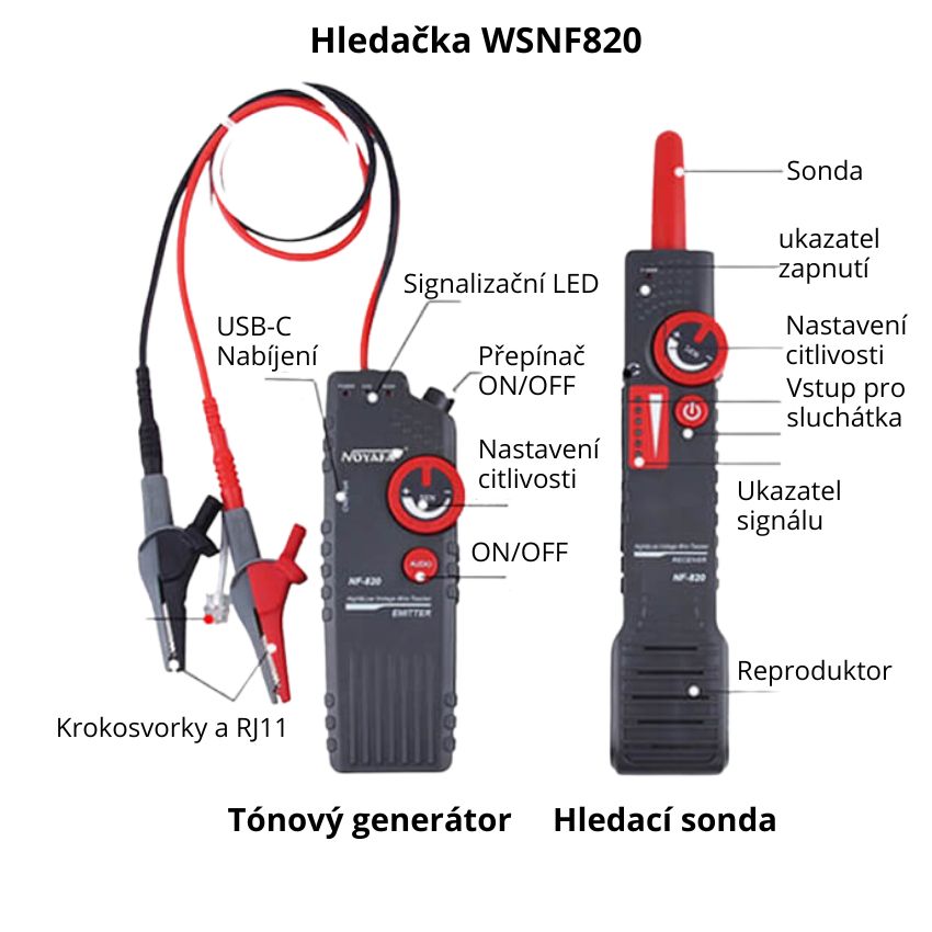 Hľadačka káblov WSNF820, dĺžka 1000m, vzdialenosť 0-2 m, 0-400V, nastavenie citlivosti, AC filter, trasovanie 1 a viac žíl. káblov.