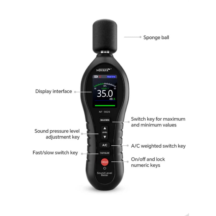 Hlukomer WSNF562S, dBA, dBC s podsvieteným displejom, ukazovateľ hodnoty Min, Max, rozsah merania 30-135dB, presnosť 1,5dB, rýchlosť 125ms, kondenzátorový mikrofón, veľmi jednoduché ovládanie.